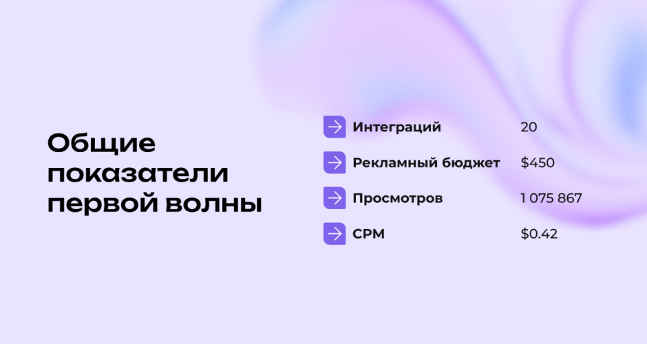 Убедившись в эффективности выбранной модели, команда перешла к расширению кампании. Количество интеграций было увеличено до 42, а эквивалент бюджета составил $1 205. За счёт усиления кросс-платформенного распространения контента, включая YouTube Shorts, суммарный объём просмотров превысил 2,6 млн. CPM остался на уровне $0,46, что подтвердило устойчивость стратегии даже при росте объёмов.