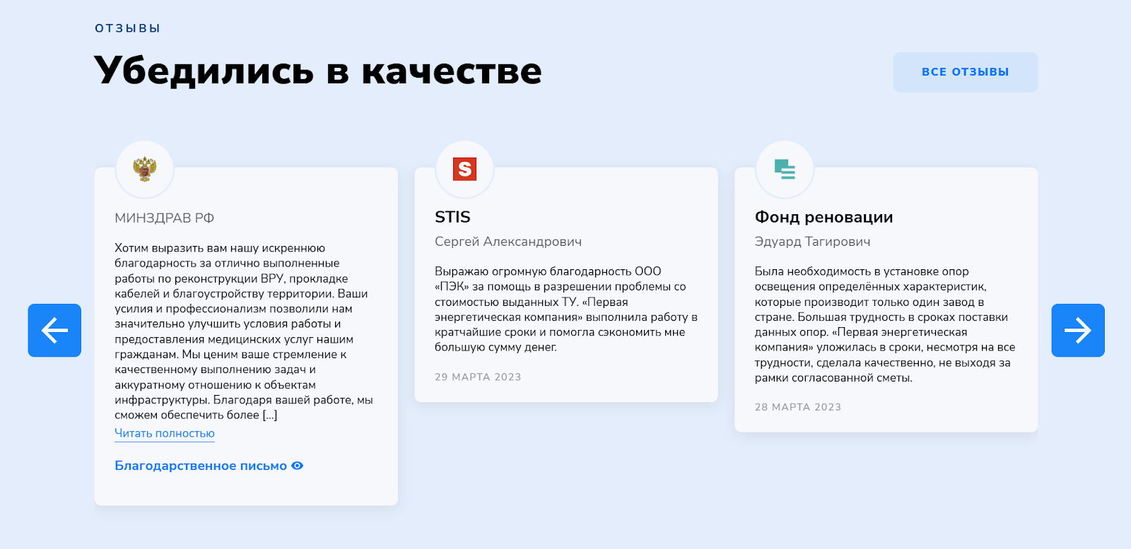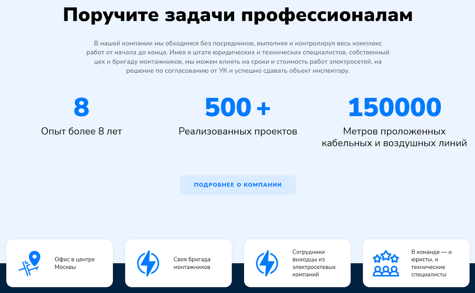 Одно из ключевых преимуществ — опыт и знания, благодаря которым клиенты компании могут экономить миллионы рублей каждый месяц за счет оптимального подключения электричества на своих объектах.