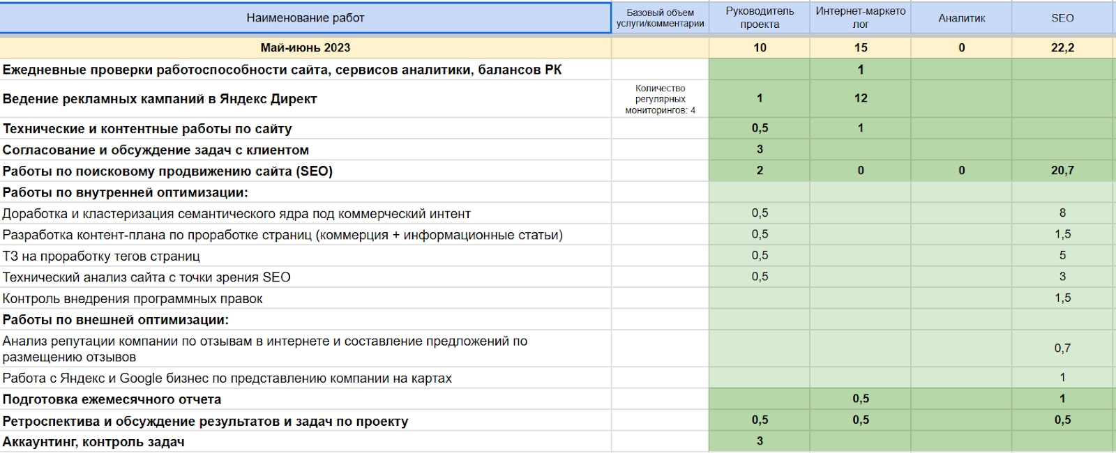 По каждому направлению мы составили детальные сметы с расчетом трудозатрат вплоть до получаса.