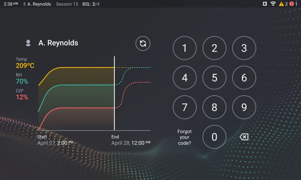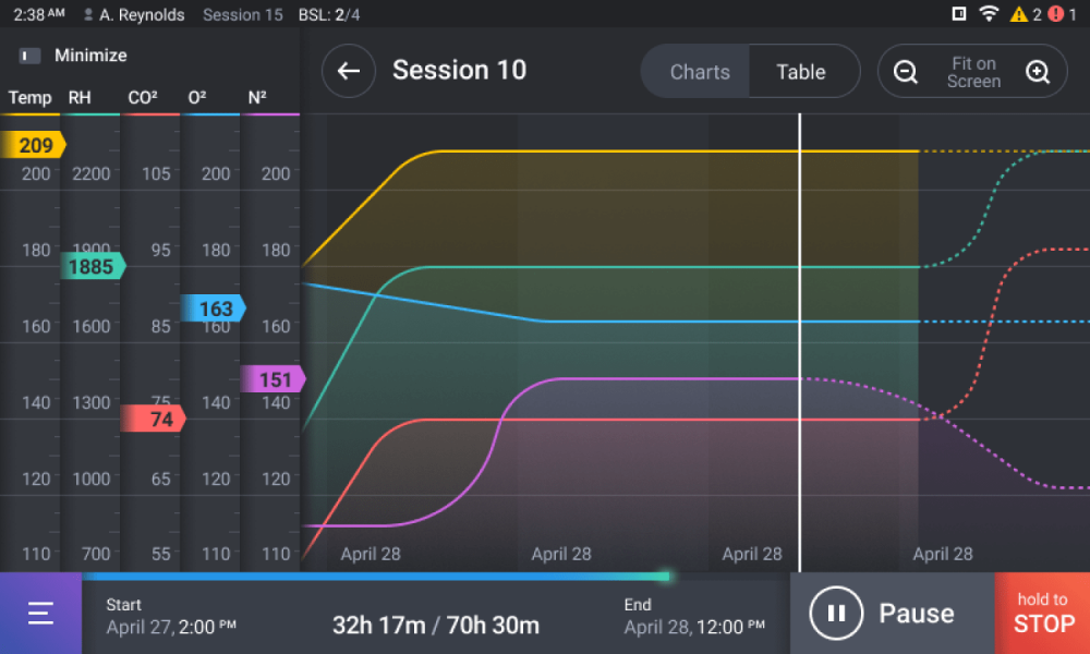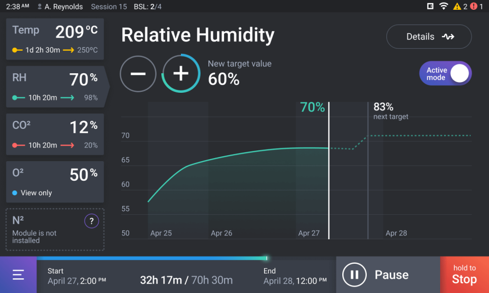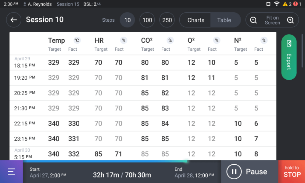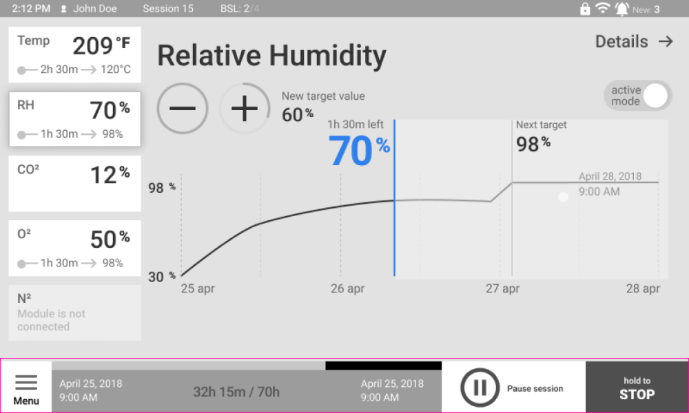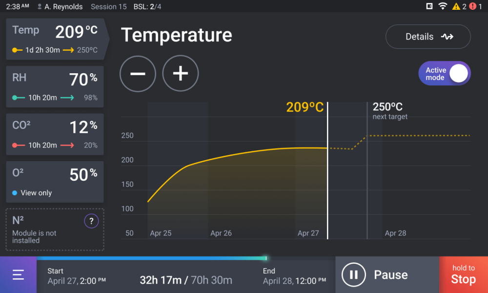 В некоторых случаях пользователям нужно повысить или снизить значение параметра в текущей сессии. Изменить температуру или концентрацию газов в камере можно с экрана мониторинга кнопками «+» и «—» соответственно.
