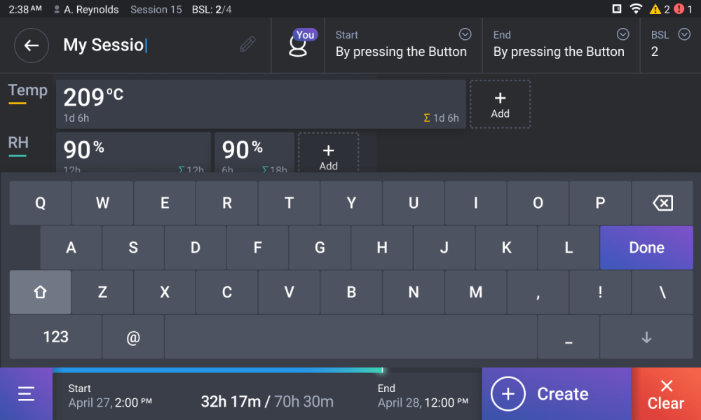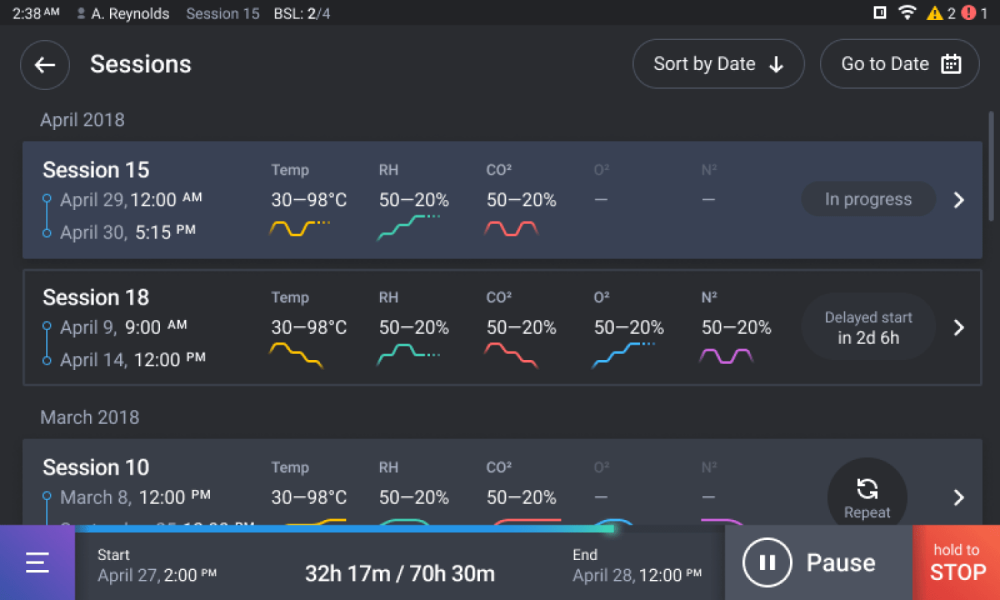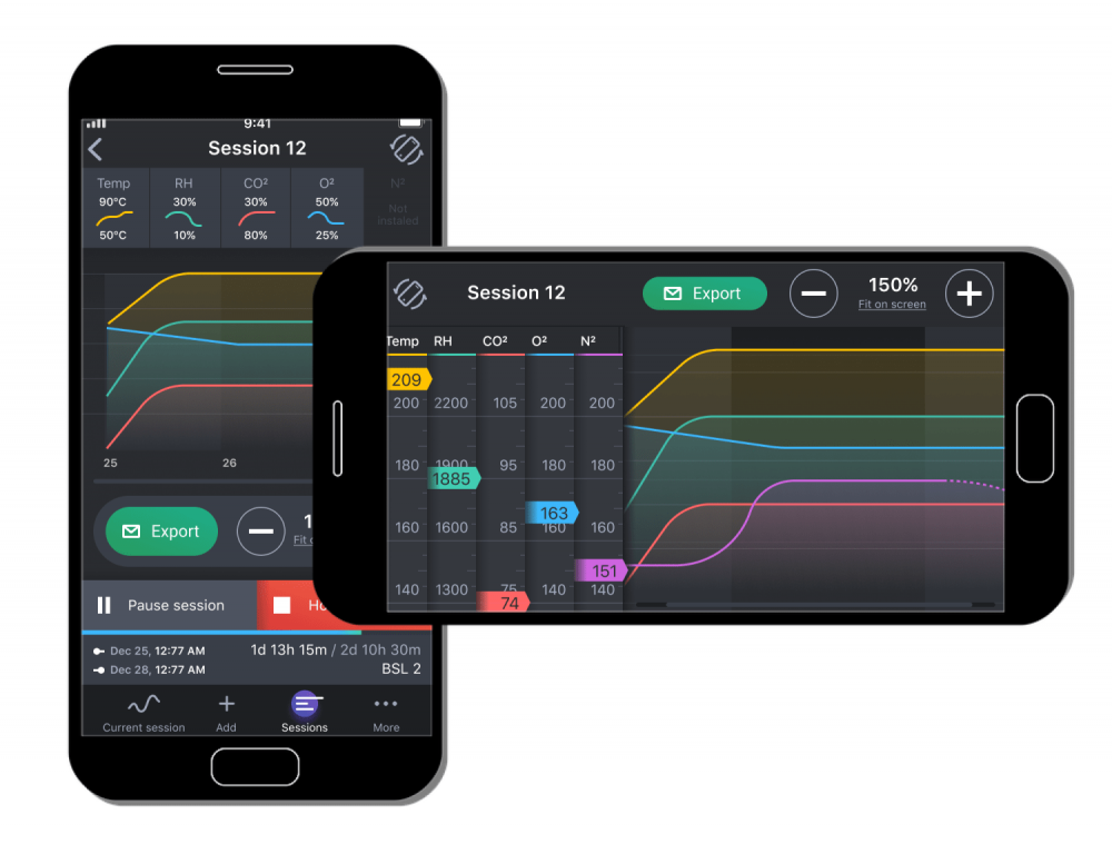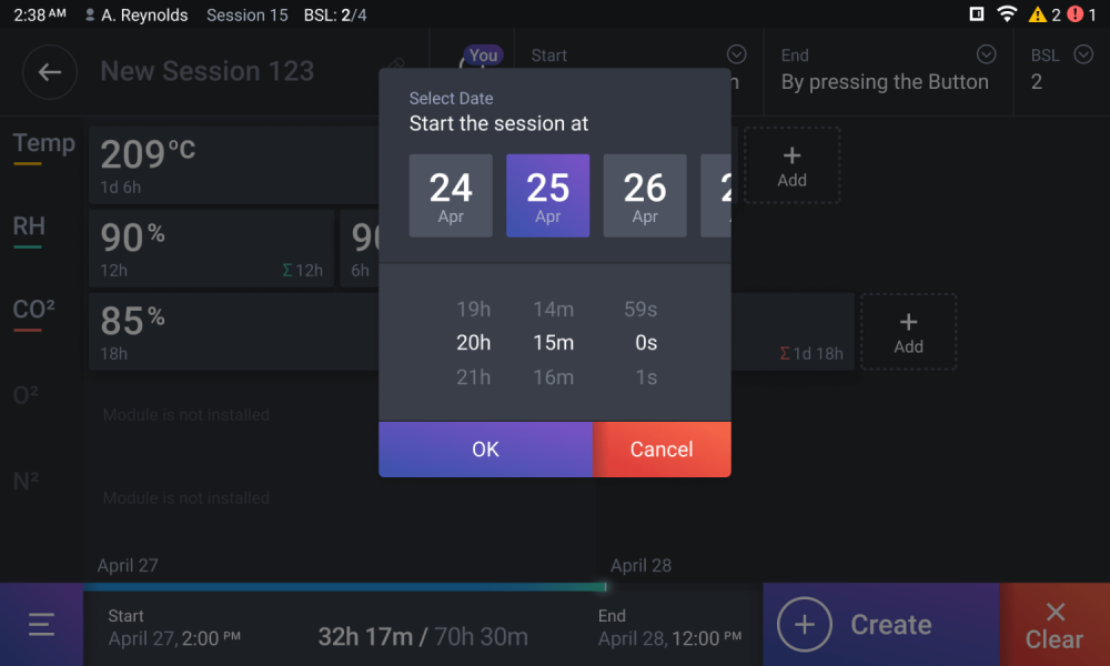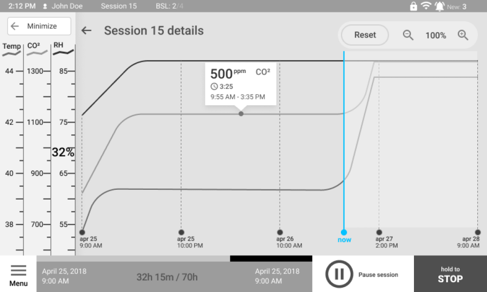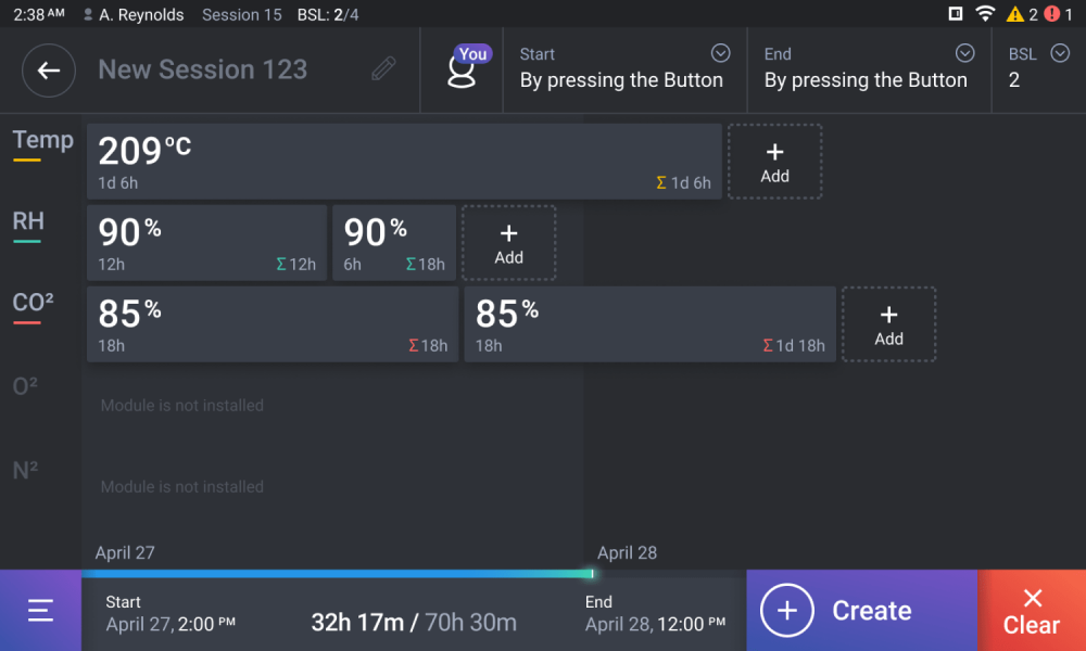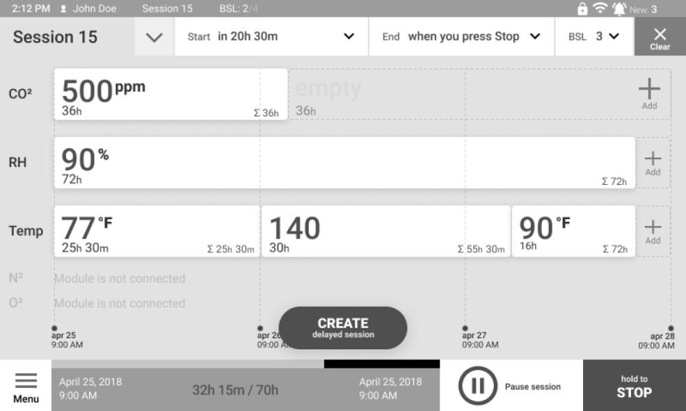 Сессия — это промежуток времени между началом и окончанием эксперимента. Сессия задается параметрами температуры, влажности и газового состава внутри оборудования в разные периоды эксперимента. По этим параметрам модули управляют состоянием внутри камеры, опираясь на показания датчиков.