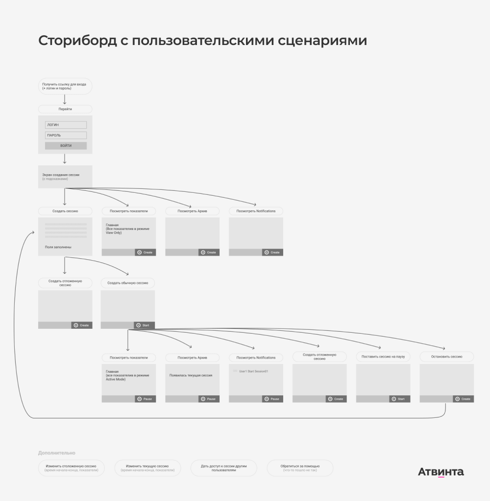 Мы построили сценарии: через какие экраны пользователь проходит, чтобы попасть в нужный раздел. Получился сториборд со всеми экранами, которые понадобятся для управления оборудованием.