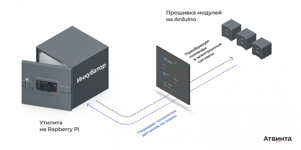 Сложность в том, что микробиологическая камера и электронные модули работают на разных процессорах. Интерфейс и сам инкубатор — на компьютере Raspberry Pi. А встроенный температурный и съемные газовые модули (CO2, N2, O2, влажность) — на микропроцессорах Arduino. Для них пришлось писать независимую прошивку, которая считывает показания датчиков и получает команды для запуска или остановки модуля.