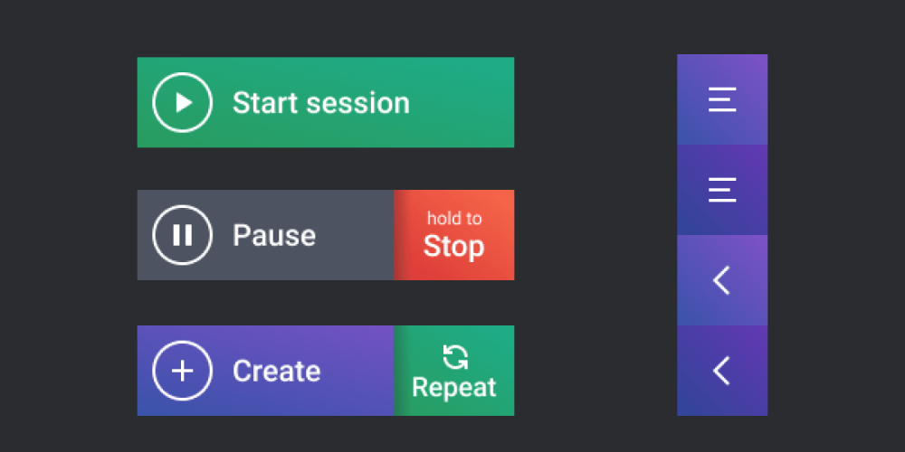 Основные цвета действий и статусов выбрали такие, чтобы они однозначно отличались от цветов обозначения модулей. Зеленым обозначили кнопку для запуск сессии, красным — остановку сессии, а фиолетовым — кнопки меню, перехода между разделами и создания сессии. Такие решения выбраны в соответствии с правилами дифференциации положительного, негативного и нейтрального действия.