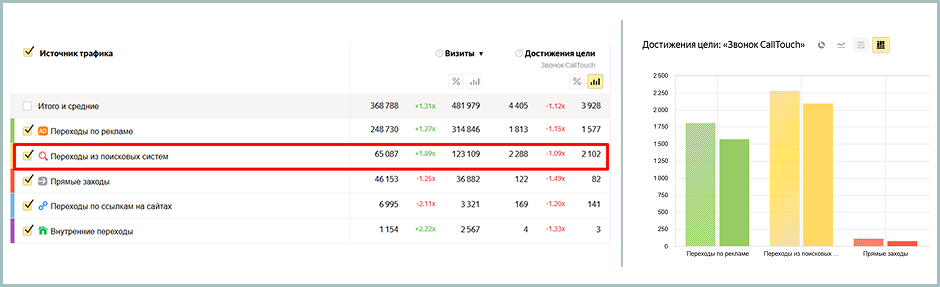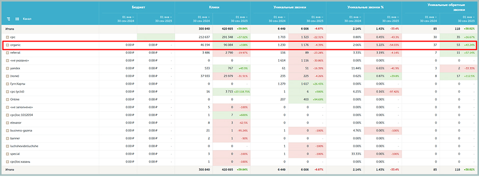 Согласно показателям Яндекс Метрики, количество целевых звонков CallTouch из органического трафика за 9 месяцев снизилось на 186 (на 9%).