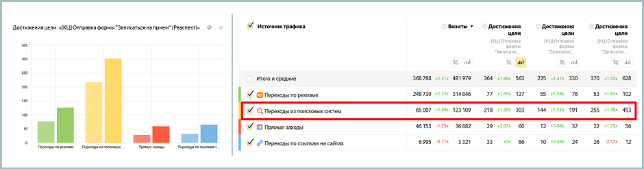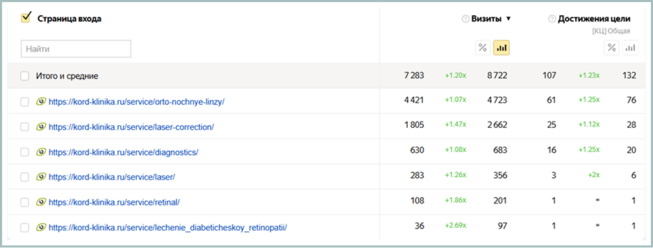 Увеличение количества заявок. Общее количество достигнутых конверсионных целей выросло на 33% (+339 целей). К ним относятся все типы форм: запись на прием, консультация, вопросы. Это прямое свидетельство роста не только аудитории, но и её качества.