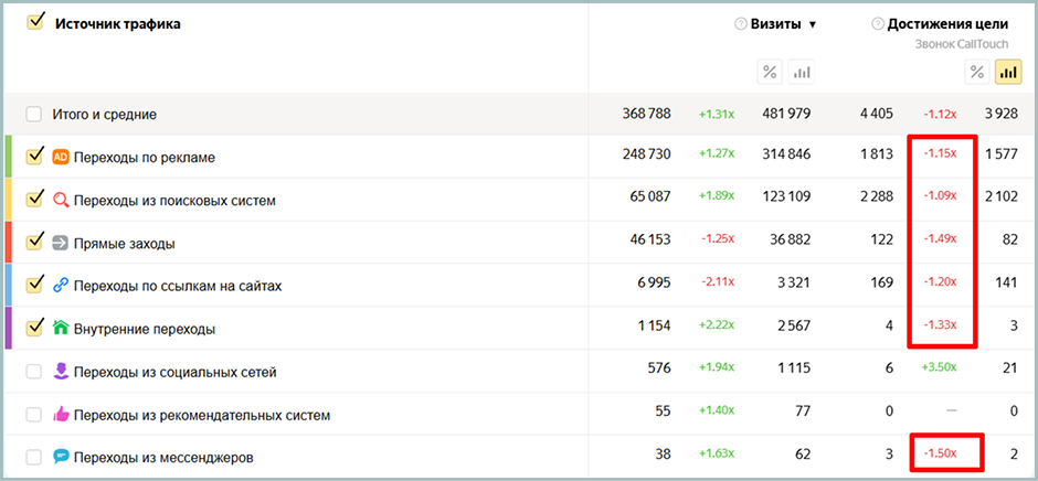 Факторы, повлиявшие на снижение числа звонков. Снижение достижения цели «Звонок CallTouch» наблюдается по многим каналам привлечения трафика. Из органики — самое минимальное снижение.