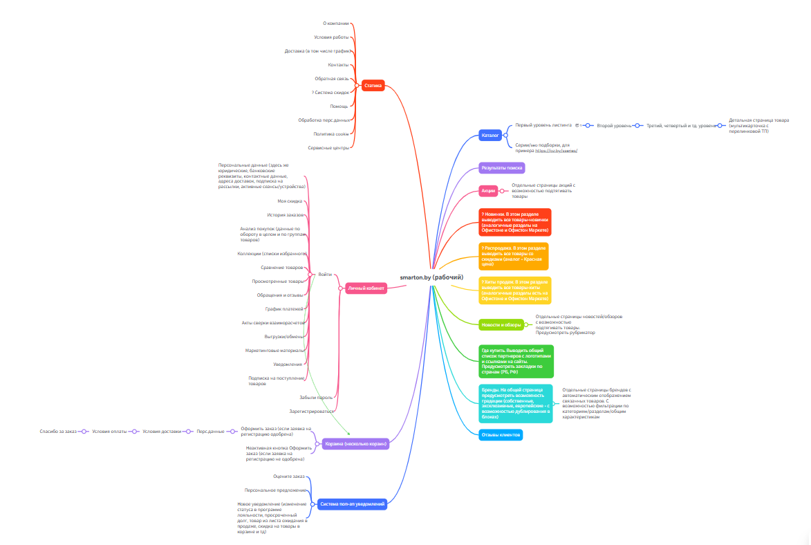 Только дизайном работа не ограничилась. Масштаба добавил документ с функциональными требованиями к проекту. В нем мы описали структуру сайта и разделов, принцип работы корзины, личного кабинета, фильтров.