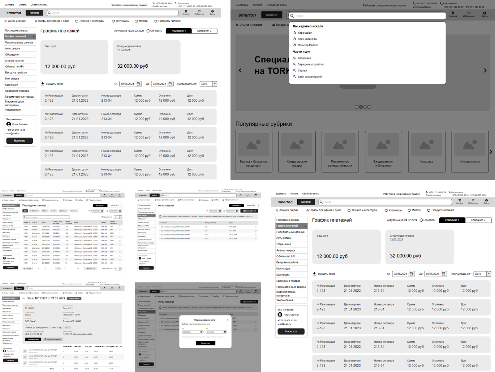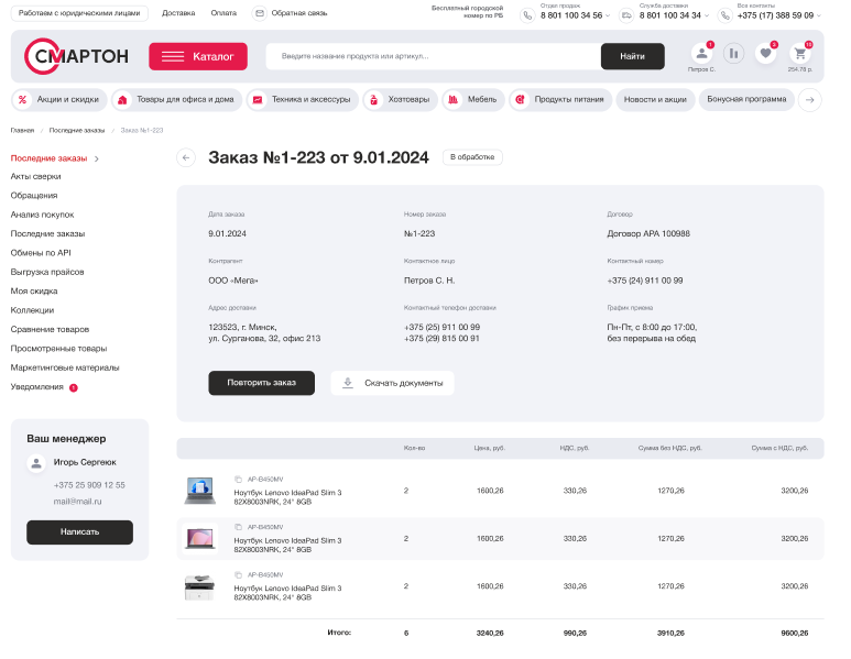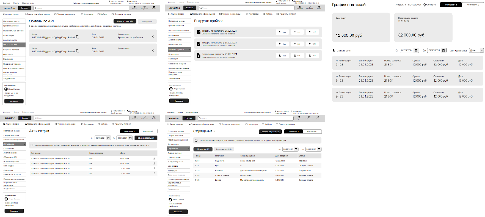 Второй ключевой момент — взаимодействие с клиентами. Корпоративных партнеров не устроит обычная корзина с выбранными позициями. Им нужен полноценный рабочий инструмент с актами сверки, графиком платежей, передачи обращений и анализом покупок.