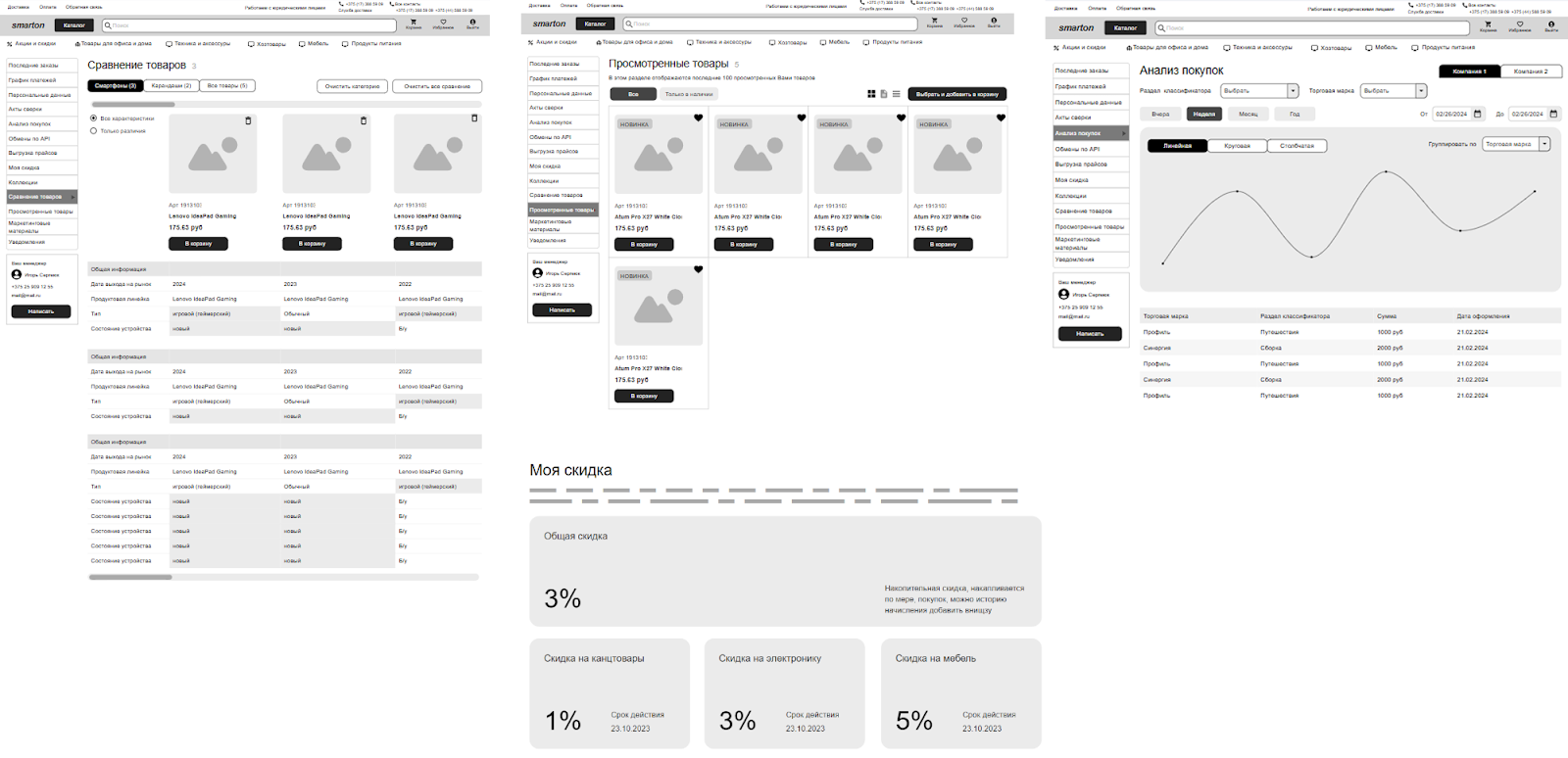 Еще пользователь может изучить список просмотренных товаров, провести сравнение заинтересовавших его позиций, уточнить персональную скидку и проанализировать свои покупки.
