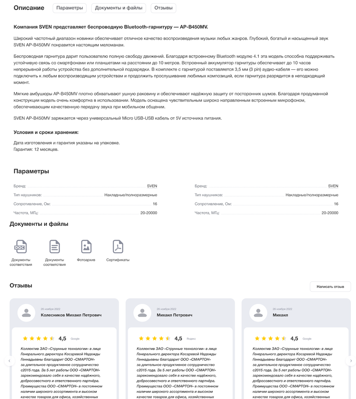 Есть возможность скачать документы и сертификаты на товар, прочесть отзывы других покупателей и посмотреть похожие позиции. Пользователь получает все и даже немного больше, чтобы определиться с выбором.