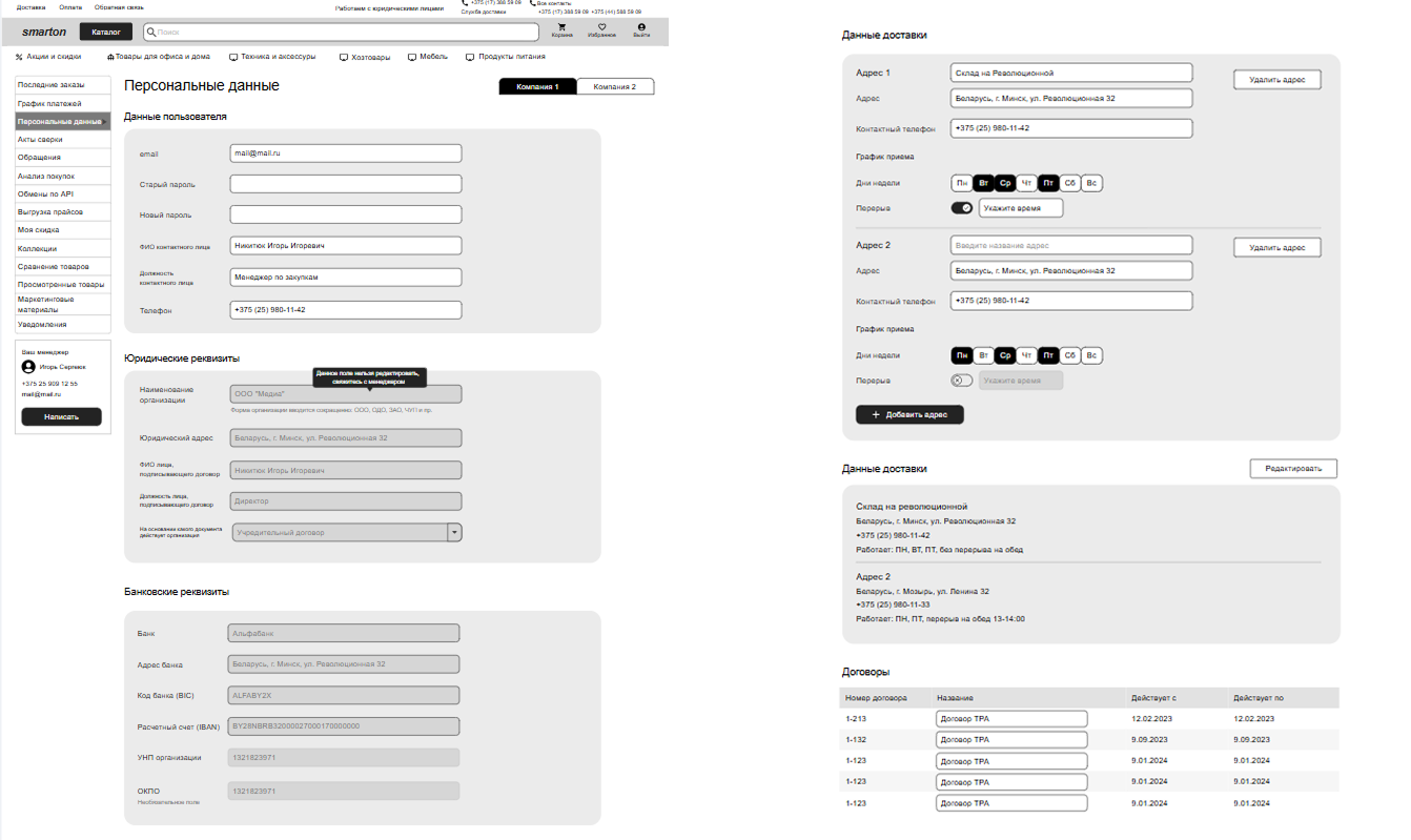 Во вкладке «Персональные данные» можно посмотреть, а в случае необходимости внести изменения, в контактную информацию, банковские и юридические реквизиты, адреса доставки, увидеть историю заключенных договоров и активных сеансов.