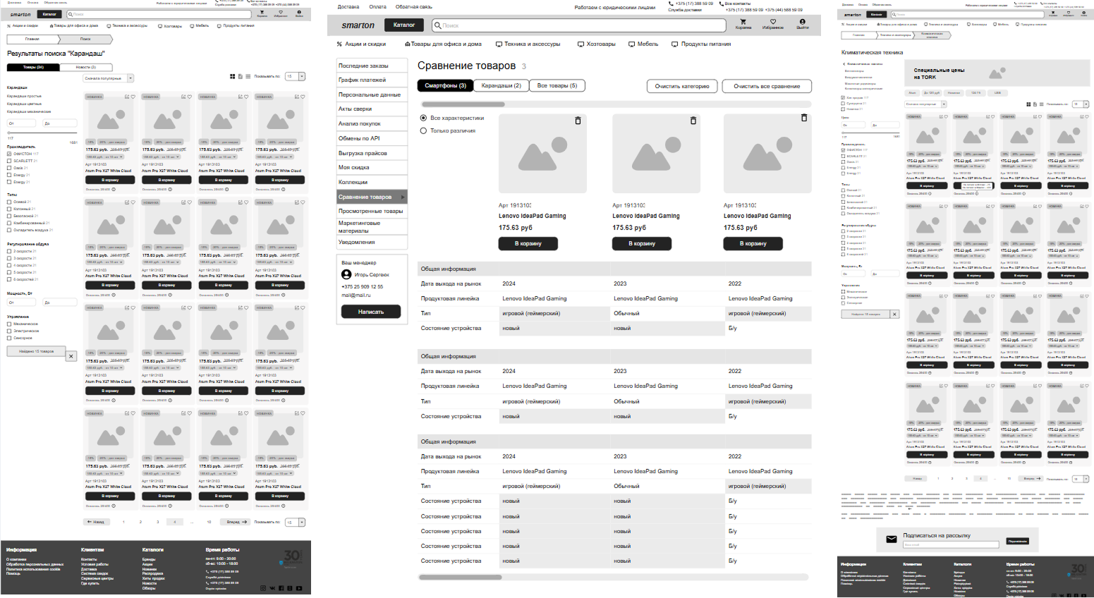 Отсюда выросла потребность в разделении работы между двумя дизайнерами. Один отвечал за ключевые «видимые» страницы: главную, каталог, карточку товара. Второй — за личный кабинет клиента и ряд второстепенных страниц (например «О компании»).