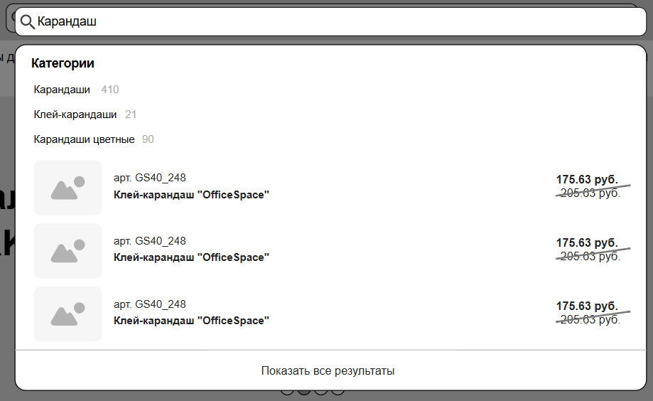 При вводе наименования появляются динамические подсказки с совпадающими категориями и товарами.