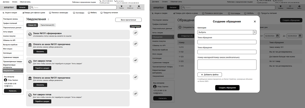 Для простоты взаимодействия с клиентами продумана страница уведомлений, а для обратной связи — форма создания обращения или контакта с персональным менеджером.