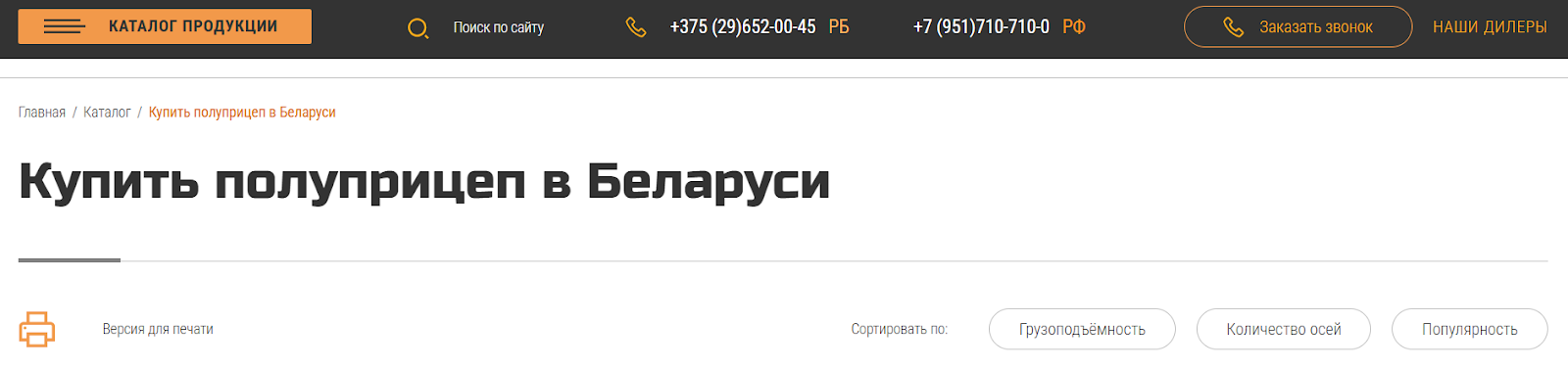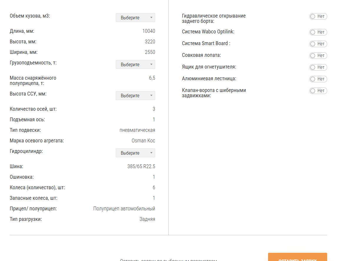 При подборе конкретной техники доступна сортировка по грузоподъемности, количеству осей или популярности.