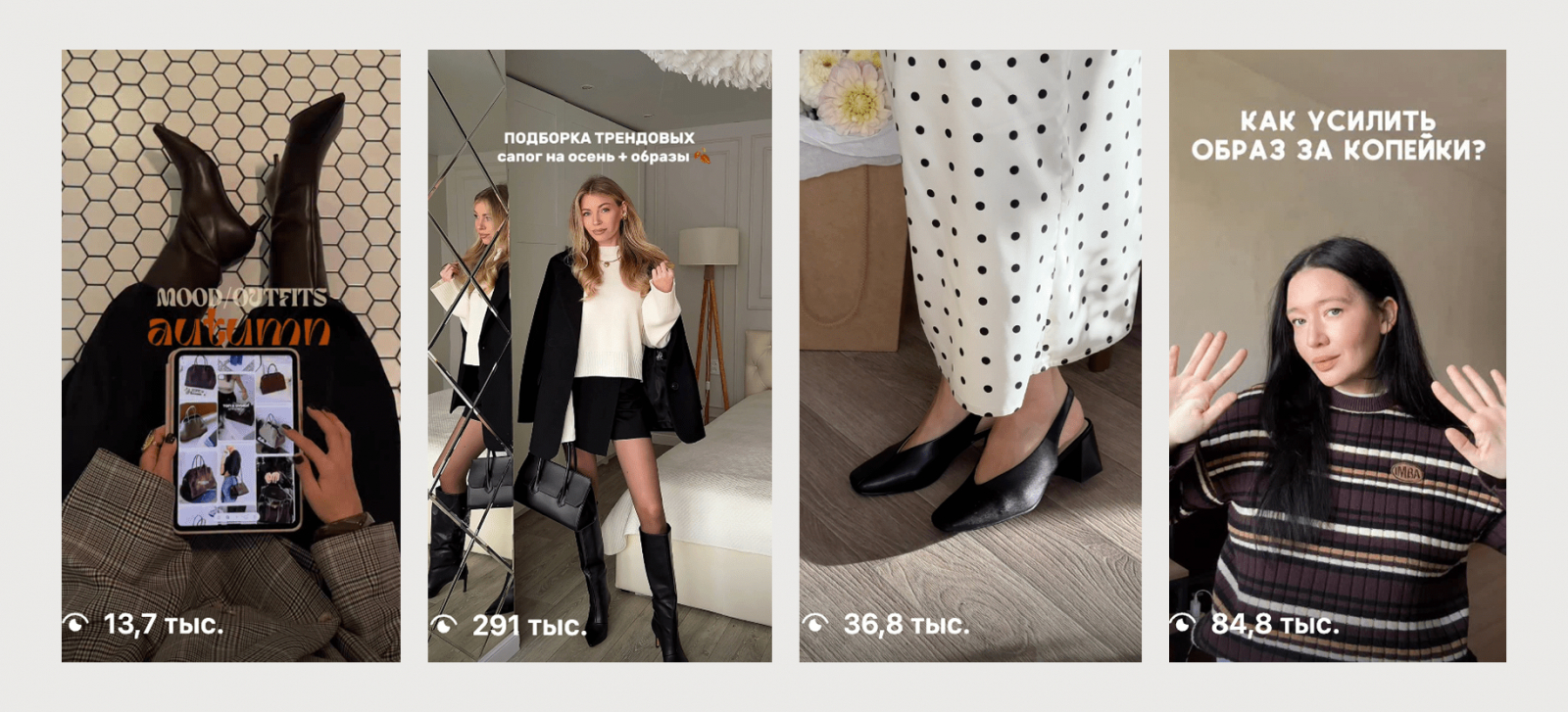 Признаемся, что поиск референсов для обувной ниши оказался чуть сложнее, чем мы ожидали в начале. Большинство сценариев в fashion-сегменте нацелено все-таки на одежду, а обувь — это один из элементов полного образа. Просто показывать обувь “в лоб” без контекста было бы заведомо провальной идеей, ведь так ролики бы были слишком рекламными и совсем не креативными.