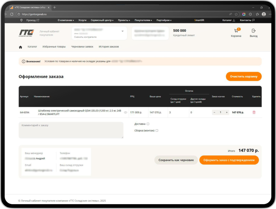Если проверка прошла успешно, появляется кнопка «Зарезервировать и заказать», доступная в течение короткого времени. Если не успеть подтвердить заказ — остатки придётся проверять повторно. При недостатке остатков система не просто блокирует отправку, а предлагает скорректировать количество или сразу связаться с менеджером — его контакты подтягиваются автоматически.