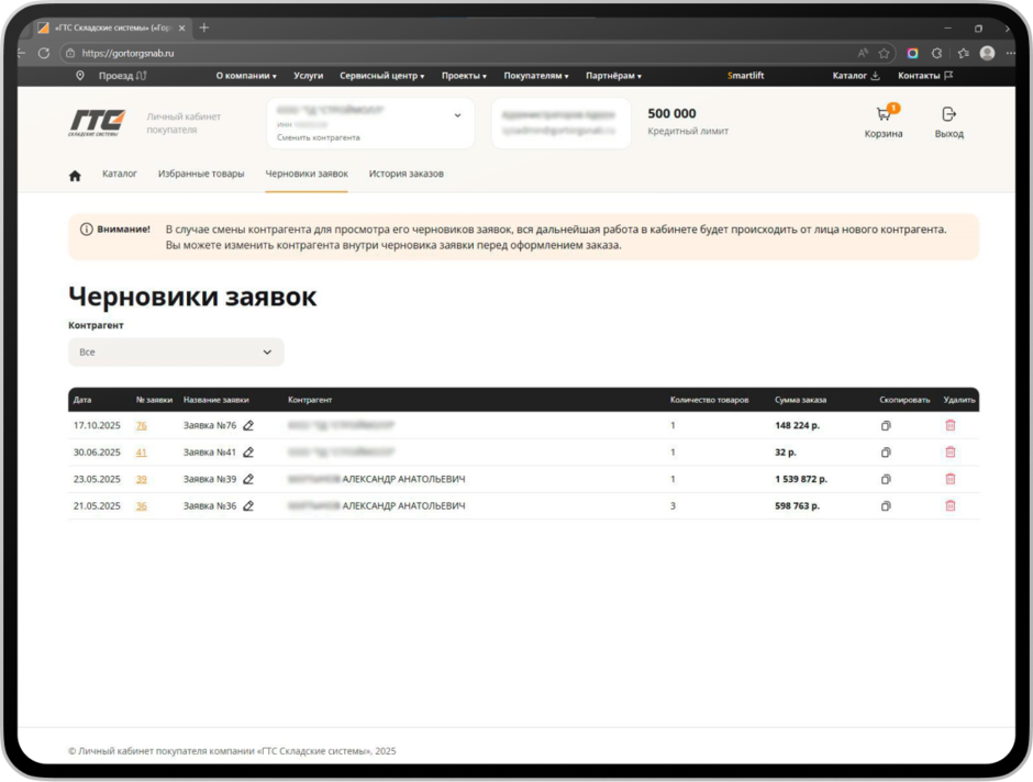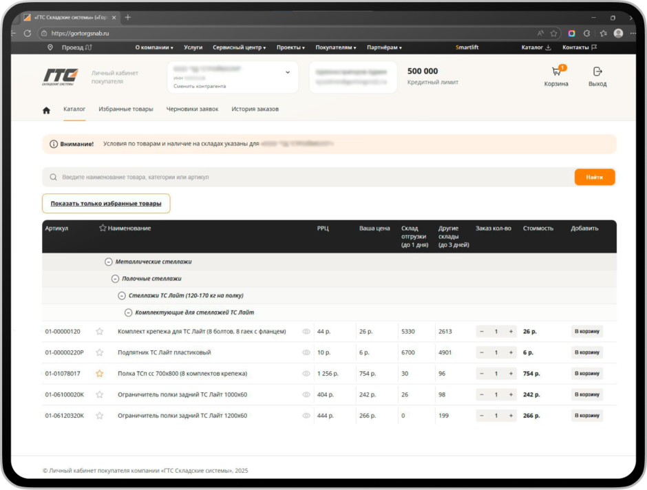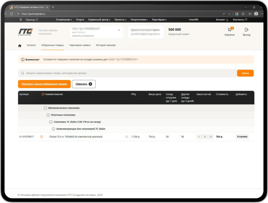 После входа пользователь видит данные строго по выбранному контрагенту, что является основным результатом интеграции, к которому мы шли. Если у него есть доступ к нескольким юридическим лицам, он может переключаться между ними и система мгновенно обновляет цены, остатки и лимиты в соответствии с выбранным договором.