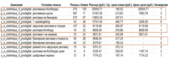 Также расширили текущую семантику, добавив маски по околотематике, например: рекламный плакат, рекламный стенд. Собрали их в отдельную рекламную кампанию с оплатой за конверсию