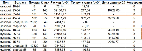 В срезе типов устройств самые дорогие конверсии были с планшетов, в части рекламных кампаний вовсе исключили данное устройство из показов. Неэффективные (когорты с высоким расходом, процентом отказов и высокой стоимостью за лид) ослабили, эффективные выделили в отдельную рекламную кампанию с ТОП сегментом аудитории.