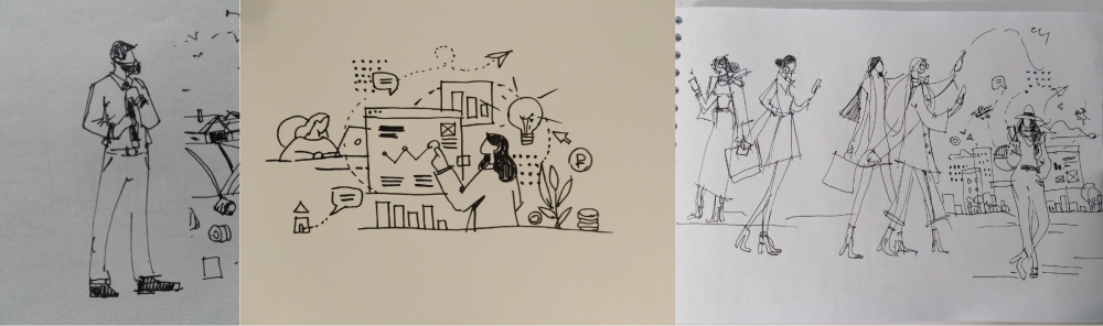 На основе референсов иллюстраторы продумали варианты персонажей и стилистику иллюстрации. Персонаж символизирует представителя целевой аудитории — предпринимателя.