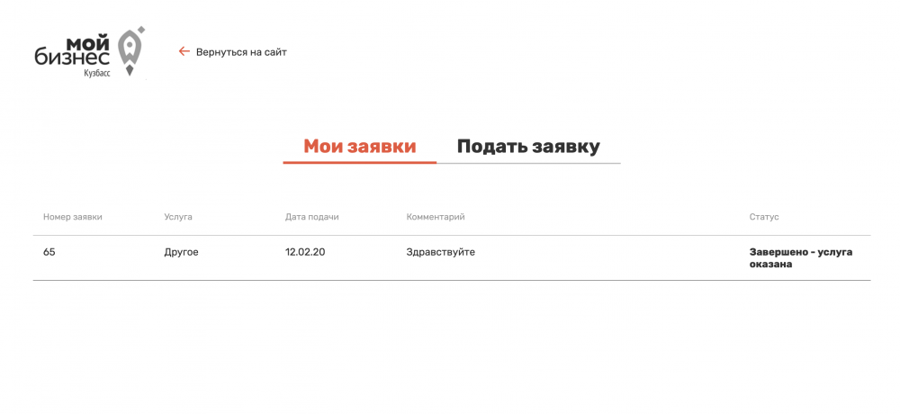 Реализован простой личный кабинет, где пользователь оставляет свою заявку или вопрос. Этот кабинет интегрирован с CRM-системой центра «Мой бизнес Кузбасс». Заявка попадает в CRM, а система автоматически меняет статус заявки, кода ее взяли в работу или отработали. Такой личный кабинет является требованием законодательства.