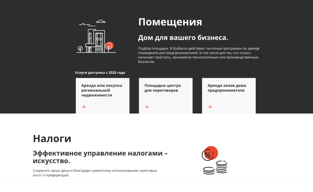 Заказчик хотел, чтобы на главной странице сайта была отражена их деятельность и все сферы бизнеса, с которыми они работают. Они предоставили нам список проектов, которые были запущены при содействии организаций центра «Мой бизнес Кузбасс», и попросили разместить на главной странице сайта.