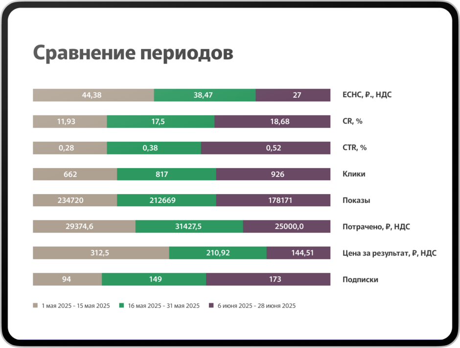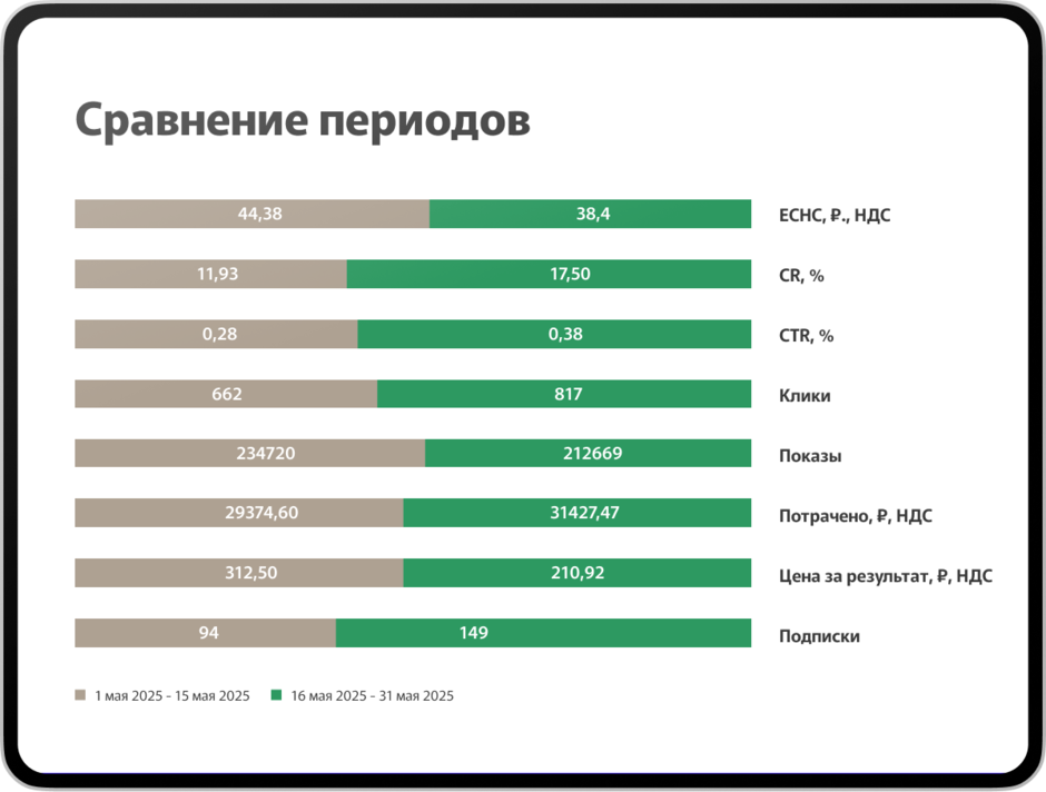 Сравнивая два периода — 01.05.25–15.05.25 и 06.06.25–28.06.25 — можно сделать вывод, что рекламные кампании были значительно оптимизированы.