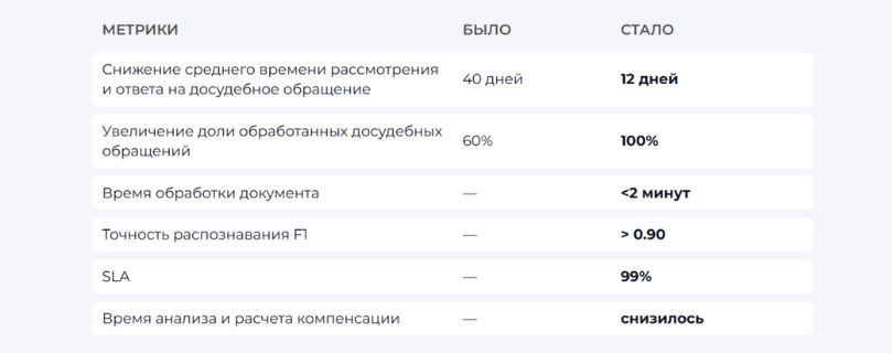 Благодаря сквозной автоматизации время обработки снижается, ручная нагрузка уходит, данные становятся единообразными и пригодными для аналитики, а поток досудебных обращений закрывается полностью.