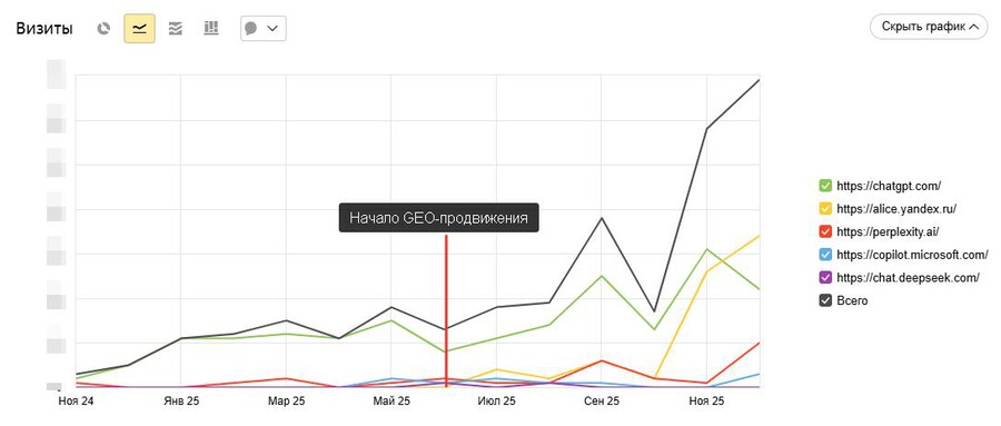 +430% рост переходов на сайт из ИИ-поиска и нейросетей. После старта GEO-продвижения виден устойчивый рост трафика со всех основных ИИ-площадок: ChatGPT, DeepSeek, Perplexity, Copilot и Алиса