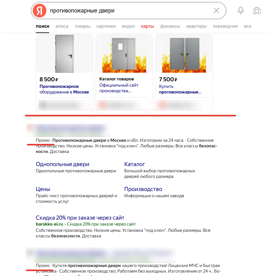 Жёсткая конкуренция в нише. Сегмент противопожарных дверей отличается высоким уровнем конкуренции: по приоритетным запросам в поиске до восьми рекламных блоков подряд