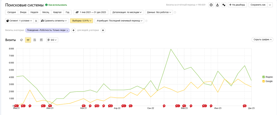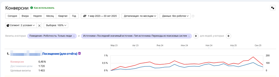 Анализ показал неожиданный дисбаланс: основной объём трафика приходился не на страницы каталога, а на статьи. Информационные публикации собирали до 1000 визитов в месяц каждая, но не приносили ни одной заявки.