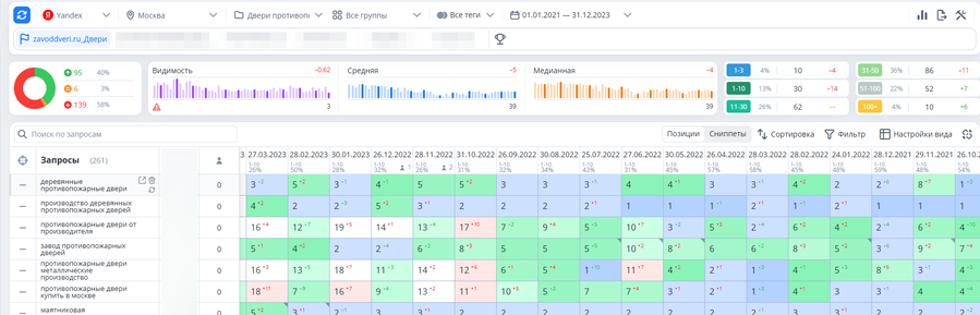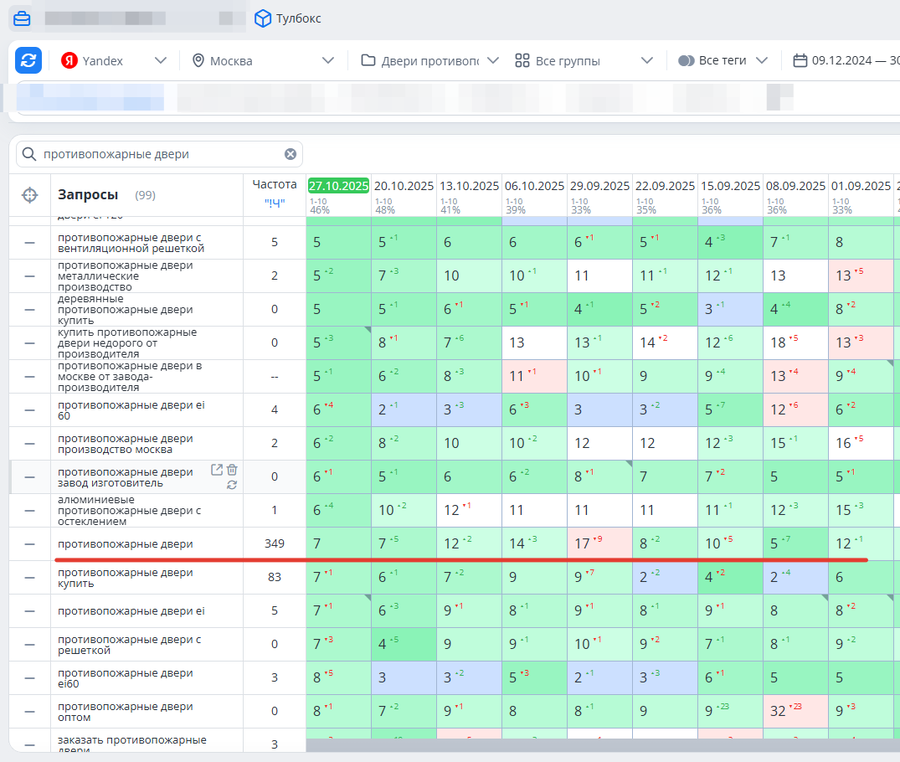 Позиции. Основной кластер запросов — «противопожарные двери» — уверенно вошёл в ТОП-10, а часть ключевых фраз закрепилась в ТОП-3 Яндекса.