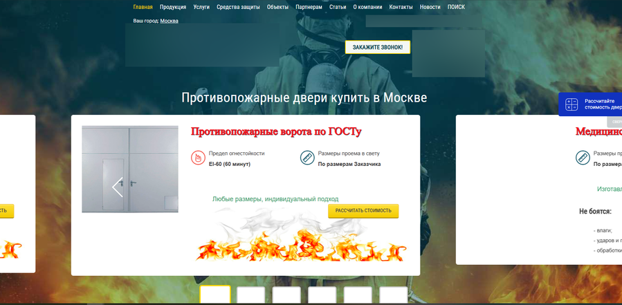 Компания — производитель противопожарных конструкций, работающий преимущественно с оптовыми клиентами и строительными подрядчиками. Сайт совмещает каталог и лендинг услуг — важно не просто показать ассортимент, а дать возможность рассчитать стоимость, заказать консультацию и оформить заявку в один клик.