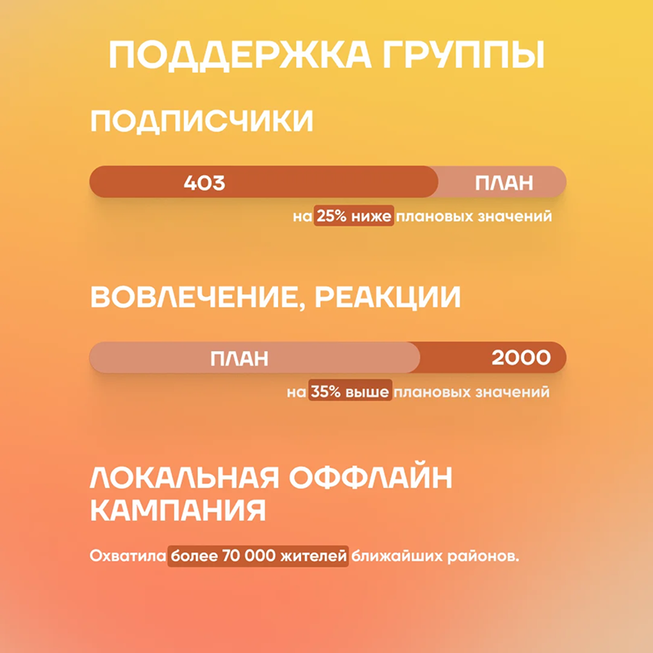 Причины невыполнения KPI — сообщество было практически пустым и группа развивалась с нуля. Изначально цена за 1 подписчика доходила до очень высоких сумм, что не позволяло выполнять план. Тем не менее, благодаря усилиям нашей команды SMM и оптимизации стратегий, мы смогли выйти на приемлемую цену за подписчика и постепенно улучшить показатели.
