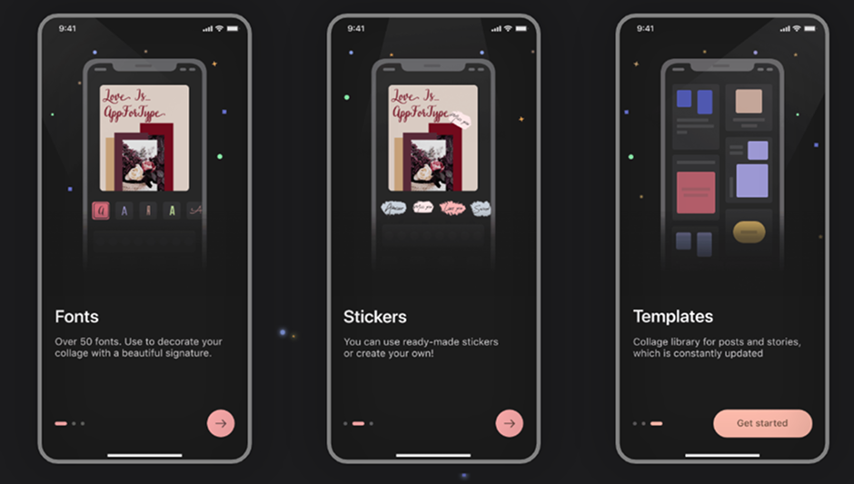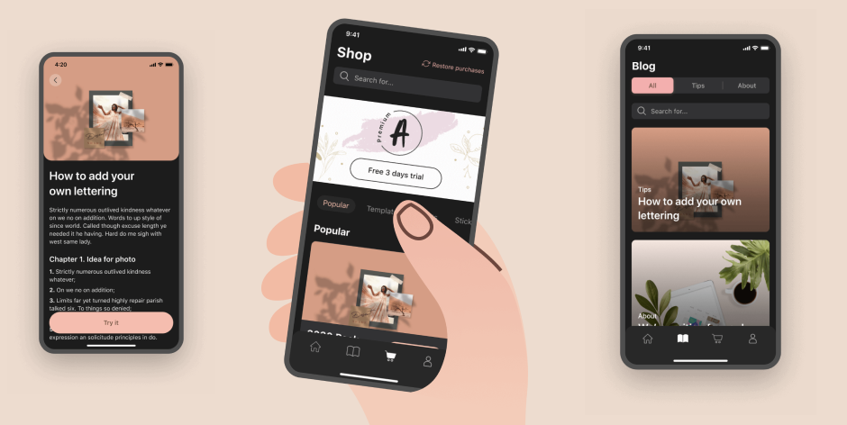 В приложении есть информативный блог, в котором пользователи могут прочитать не только инструкции, но и полезные статьи про ведение соцсетей и искусство фотографии. Так же мы переработали магазин, где пользователь может приобрести стикеры, наборы и шрифты.