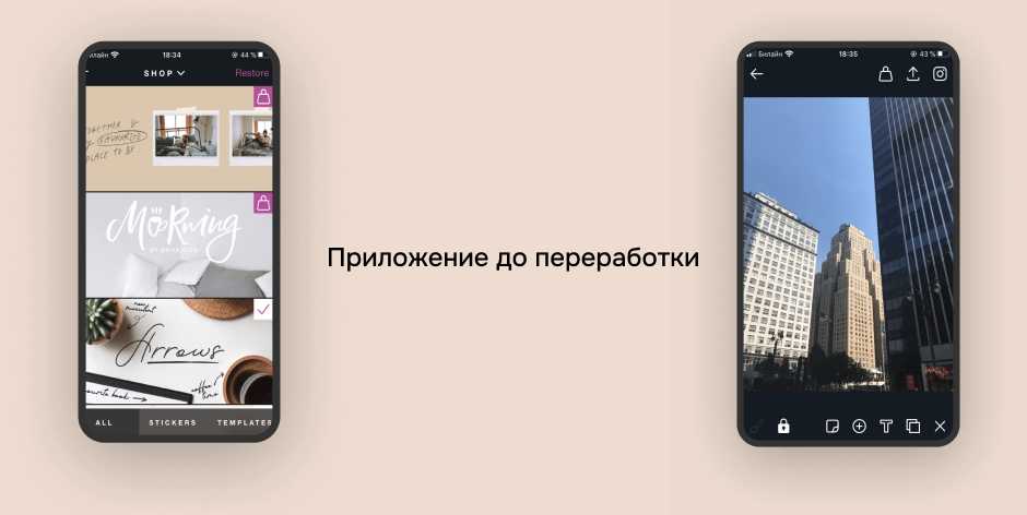Изучив пользовательский опыт, стало понятно, что основная проблема – неудобная работа с фотографиями. Поэтому, особое внимание было уделено работе с редактором. На рабочий экран мы вынесли и подписали основные инструменты, добавили функцию предпросмотра фотографий «Intagram* Preview» и быстрого возврата к предыдущей версии.