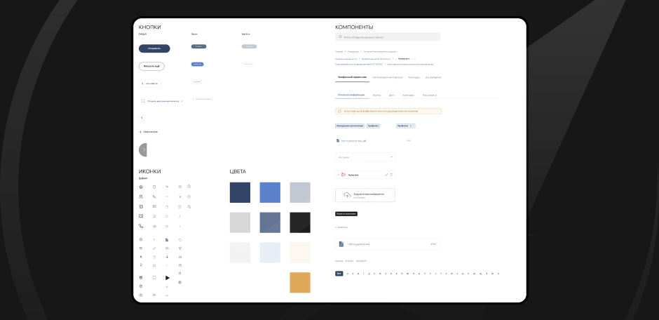 Чтобы выдержать единый стиль в интерфейсе корпоративного портала, мы разработали подробный UI-kit в соответствии с корпоративным брендбуком — в нём регламентированы цвета, типографика, состояние элементов и компонентов.