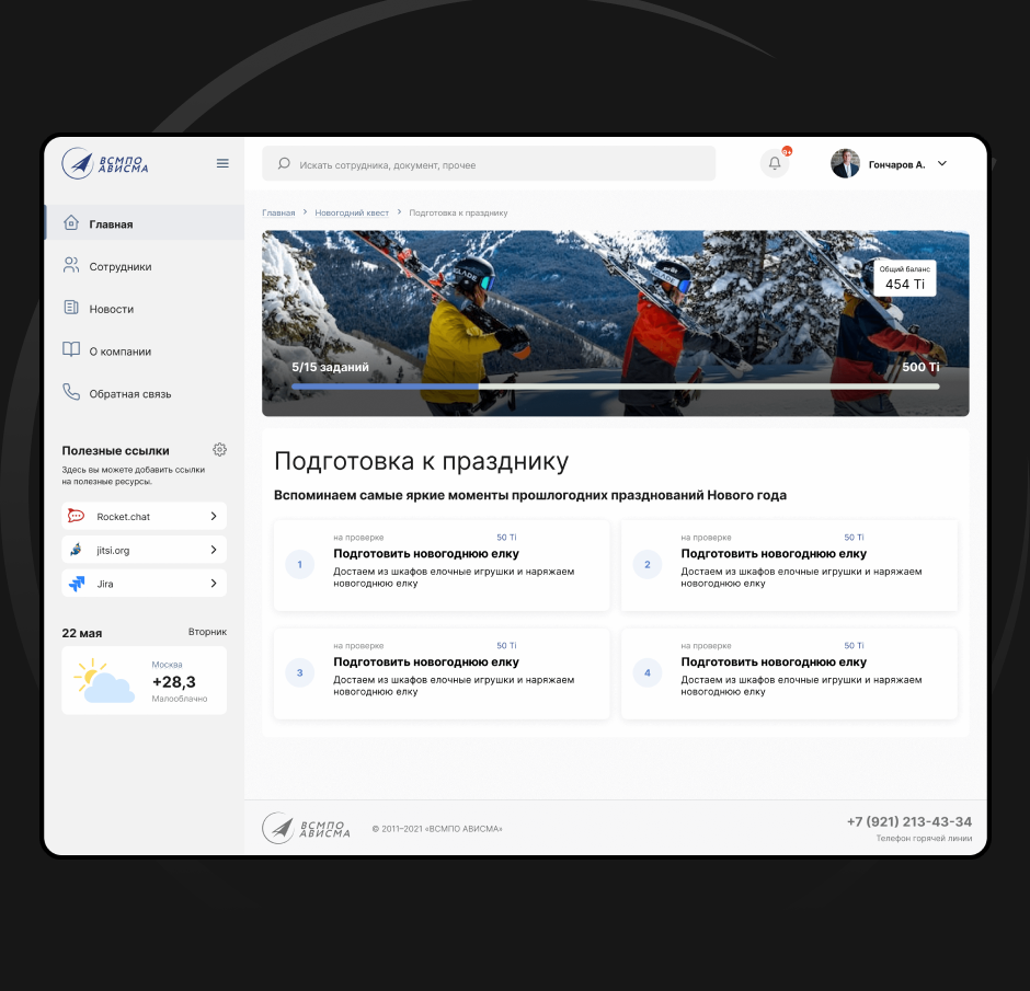 В преддверии новогодних праздников мы помогли запустить в Корпорации Новогодний квест – новый инструмент корпоративных коммуникаций с элементами геймификации. Суть квеста состоит в выполнении заданий, за которые на баланс сотрудников зачисляется внутренняя валюта Корпорации — «титаны» (Ti).