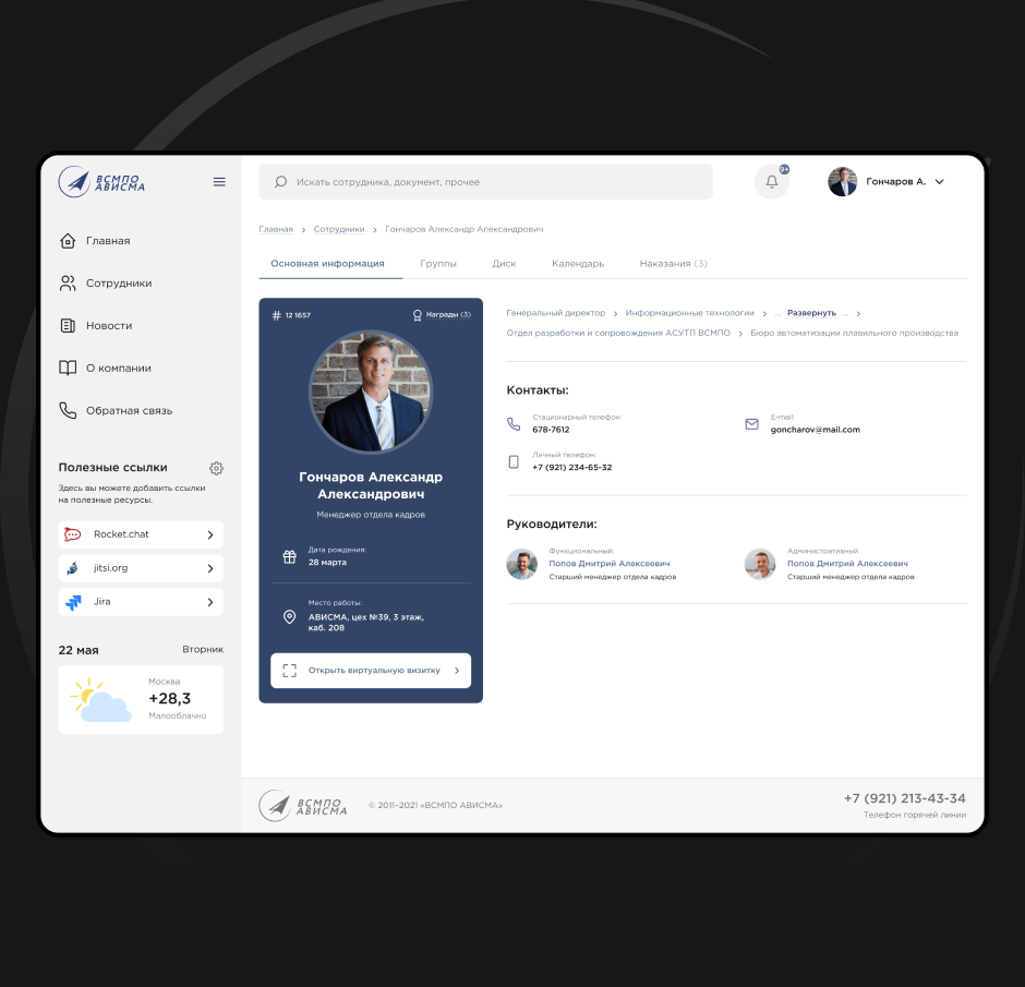 В личном кабинете отображается вся необходимая информация о сотруднике, которая может пригодиться коллегам: контактные данные, ФИО непосредственных руководителей, информация об участии в корпоративных объединениях и активностях.