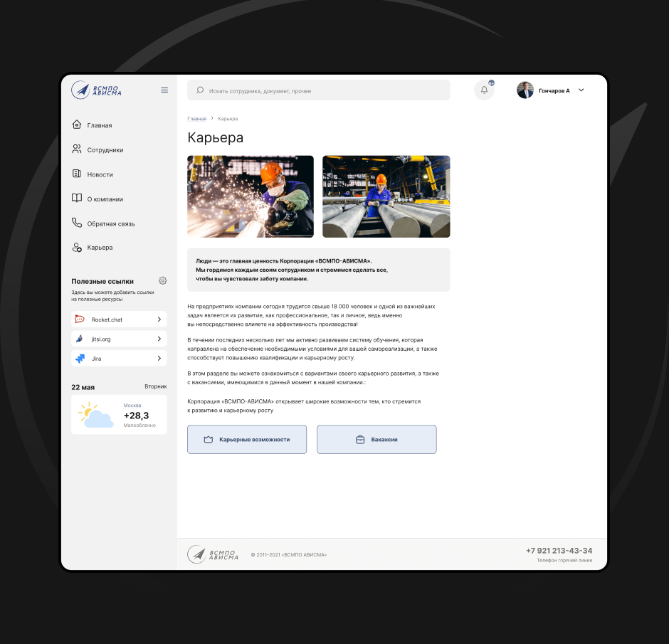 В этом разделе сотрудники могут ознакомиться с внутренними вакансиями Корпорации и узнать больше о вариантах своего карьерного развития