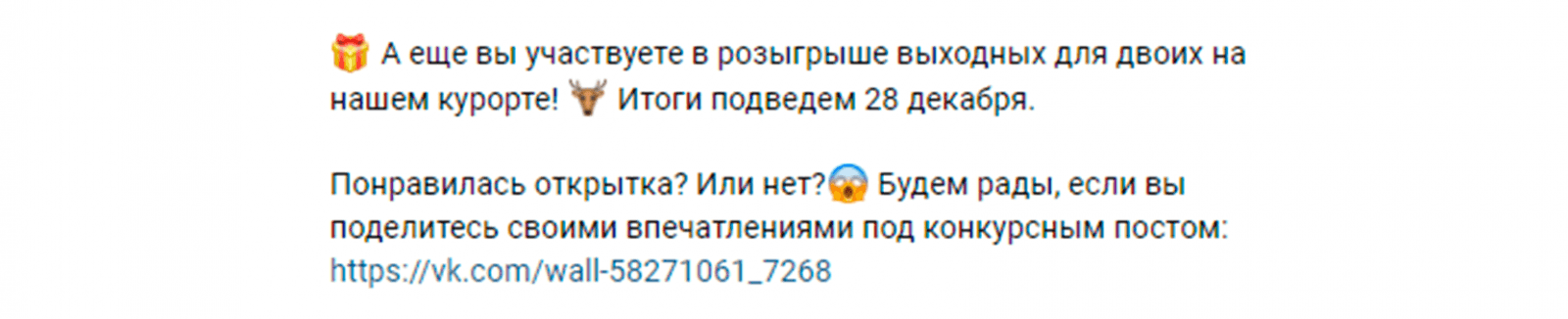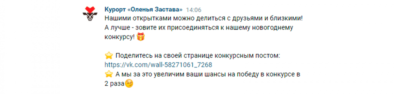 После того, как человек получил открытку и согласился или не согласился на получение новых, мы отправляем еще одно сообщение. В нем, снова совершенно искренне, просим поделиться конкурсным постом с друзьями, чтобы и они могли получить открытки. А за это мы еще и увеличим их шанс на победу в 2 раза.
