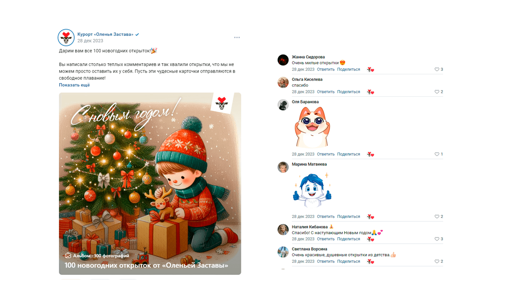 Мы не просто так решили подвести итоги 28 декабря. В этот день всех участников нашего конкурса ждал сюрприз - мы выложили весь пак открыток в общий доступ. Люди залипли в альбом, позабирали себе понравившиеся открытки и отправляли их близким на НГ.