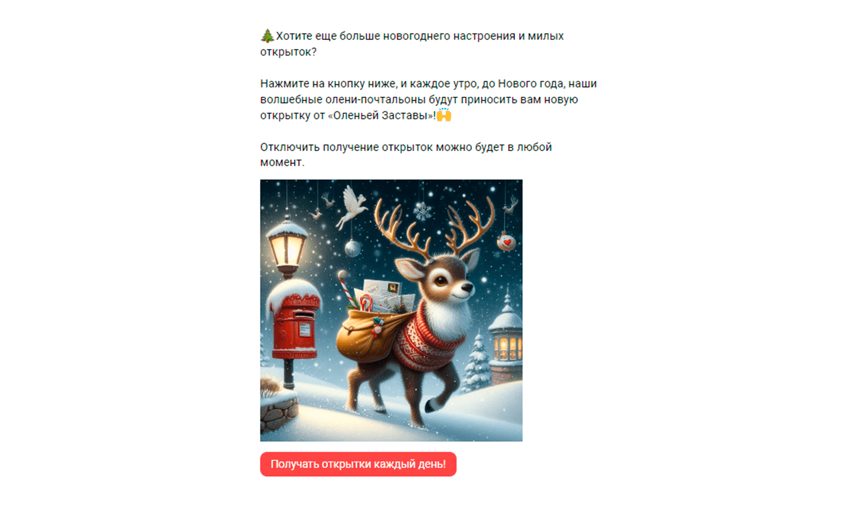 Мы предлагаем человеку получать случайную открытку с поздравлением каждое утро, вплоть до Нового года. По статистике, 71% нажали кнопку и продолжили взаимодействовать с нами каждый день.