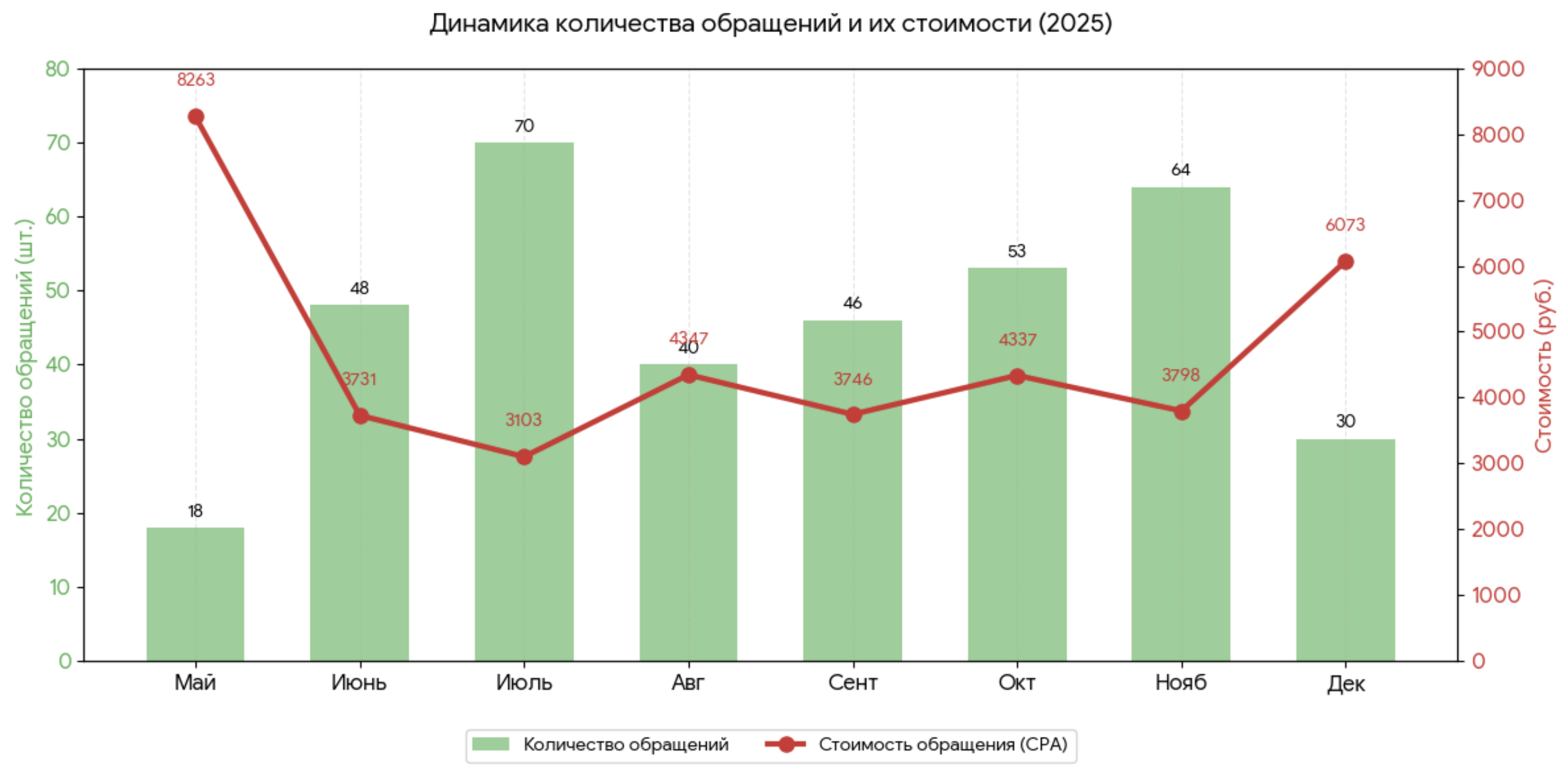В пиковые месяцы сезонного спроса количество обращений доходило до 70 в месяц. В низкий сезон объём снижался при росте стоимости, что соответствует рыночной динамике.