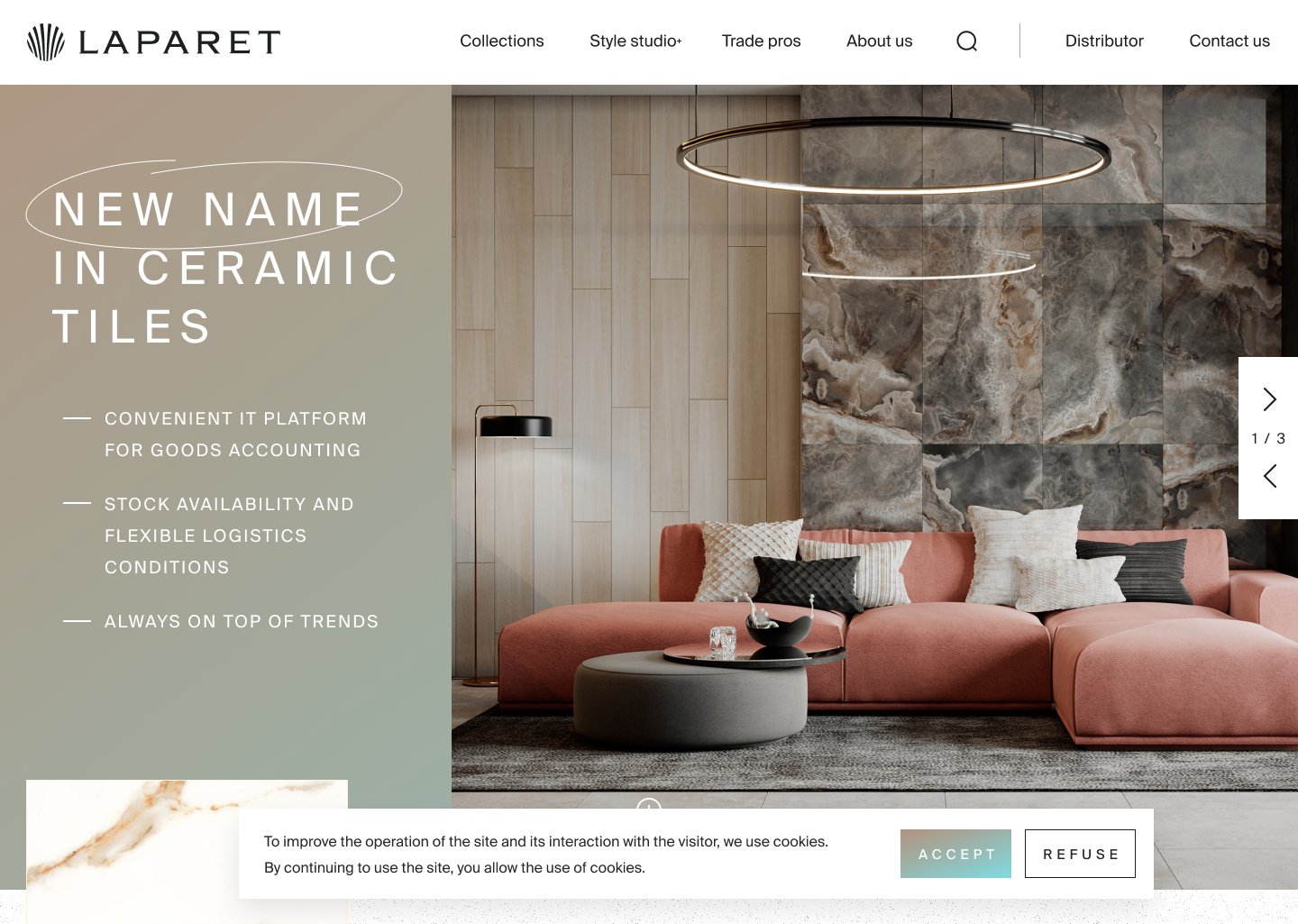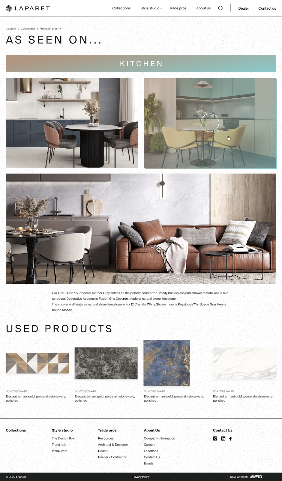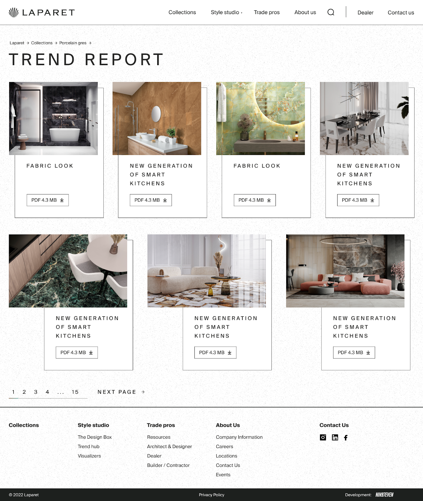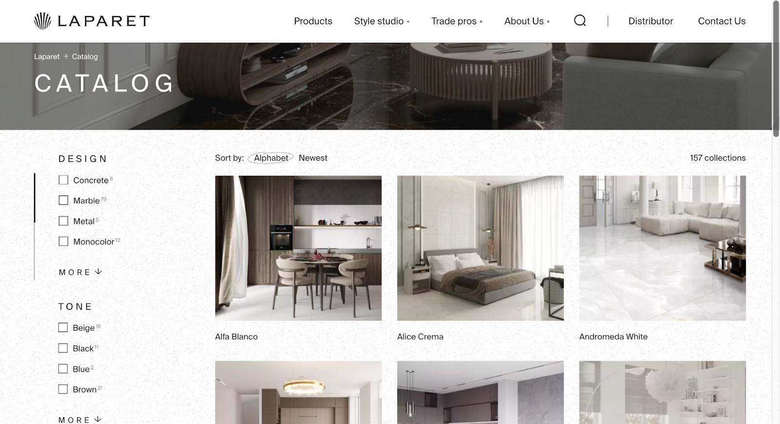 В старой версии сайта каталог был набором фотографий на одной странице без возможности сортировки. Мы спроектировали новую систему, где товары можно фильтровать по цвету, стилю, формату и назначению. Импорт позиций теперь выполняется прямо из админки October CMS — сотрудники Laparet могут добавить товар без участия разработчиков. Для галерей и каталогов достаточно загрузить файл и задать название.