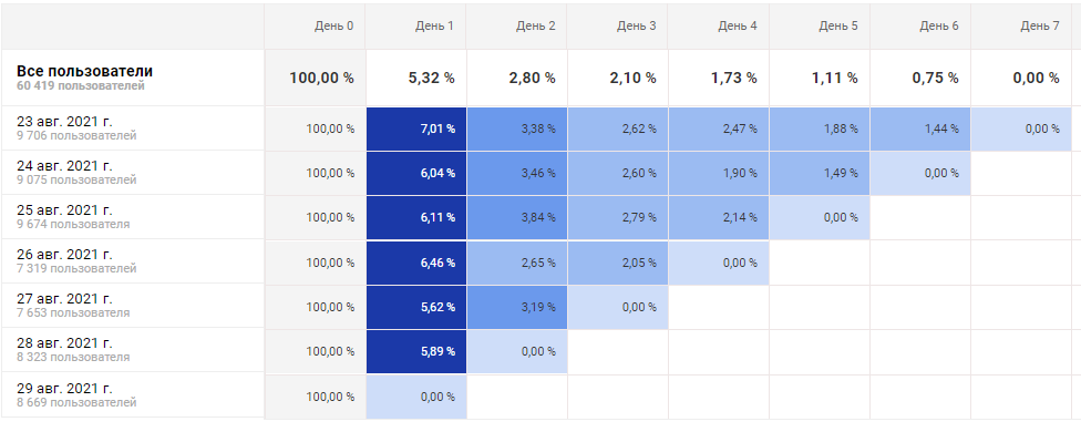Пользователей сайта становилось больше, но главная проблема заключалась в том, что они приходили и так же стремительно уходили. Коэффициент удержания после первого дня составлял всего 5,32%.