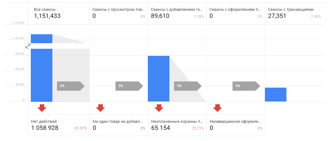 Внутренняя система аналитики данных, к которой мы сразу обратились, не смогла объяснить, на каком этапе пользователи отваливаются и почему не возвращаются. Все дело — в отсутствии воронки поведения покупателей. Именно она дает понять, как пользователи себя ведут на сайте, какие шаги совершают и где теряют интерес.