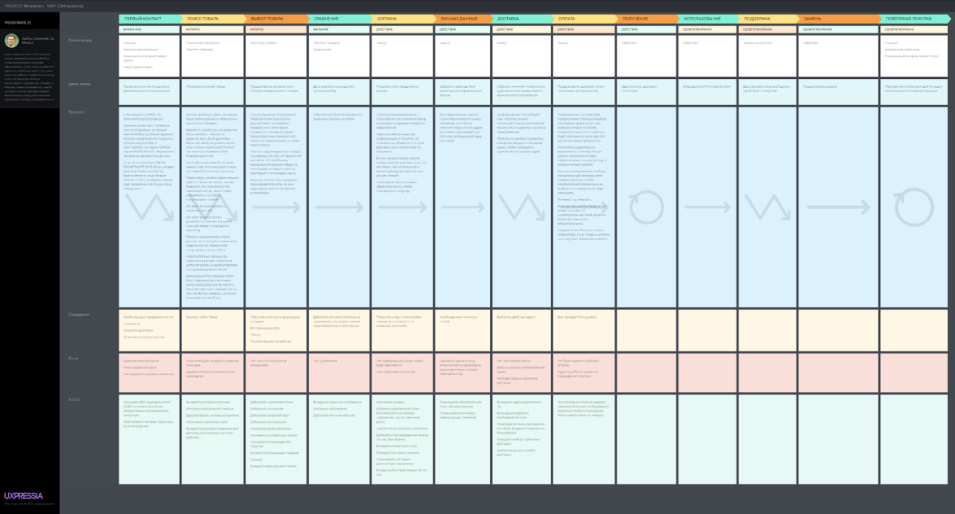 Через призму интересов, потребностей и ограничений персонажа мы построили карту пути клиента (CJM). Она показывает, что чувствует, думает и делает пользователь, когда оказывается на сайте. CJM дает увидеть процесс глазами покупателя, выявить болевые точки и улучшить клиентский опыт.